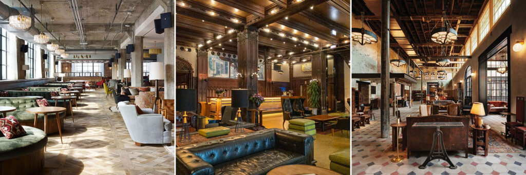 I’ve long admired projects that thoughtfully revive historic spaces—places like the lobbies at Soho House Chicago and the Chicago Athletic Association as well as the Hotel Emma in San Antonio (pictured below, from left). These spaces feel layered and full of interesting items that each tell a story, mixing industrial with warm coziness.
