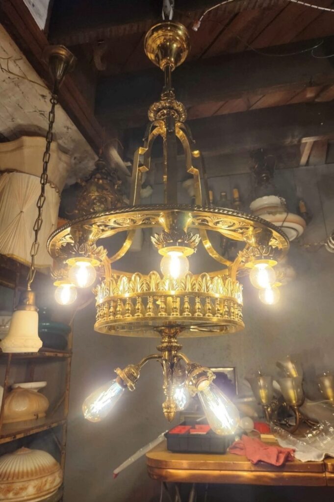 The owner greeted me and asked me to come in because the chandelier was in the cellar. This was breaking all the rules of online buying…never enter the home! But I wanted that chandelier. “Go ahead,” he said, and I carefully made my way down the narrow wooden stairs, wondering what I had gotten myself into. When I reached the dark bottom, I nervously turned the corner and saw a glow in the back of the next room: a breathtaking Art Deco brass, theater-style chandelier. In that moment, I knew it belonged in our new home. (And I lived to tell the tale!)
