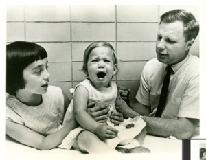 Pictured: A 1966 photograph that accompanied Merck’s press release about the successful vaccine Mumpsvax depicted Jeryl Lynn comforting the crying Kirsten as the younger girl received her vaccination with the Jeryl Lynn Strain from Dr. Robert Weibel. Credit: The National Museum of American History