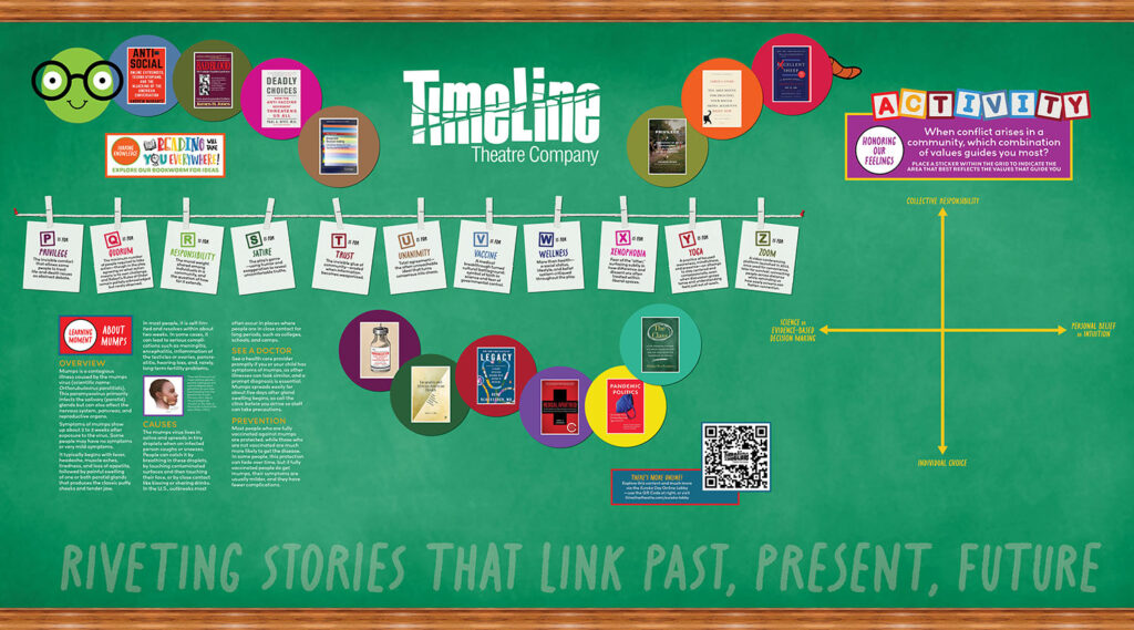 Want to spend more time perusing TimeLine’s lobby exhibit, or can’t make it to Broadway In Chicago’s Broadway Playhouse to see it in person? Here’s a look at the info currently wrapping the giant pillars in the Playhouse lobby (click on each image to access a PDF for closer viewing).